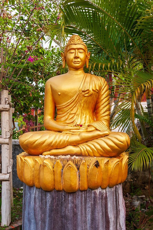Laos- Luang Prabang. Golden Buddha statue with elongated earlobes. White Modern Wood Framed Art Print with Double Matting by Haseltine, Tom