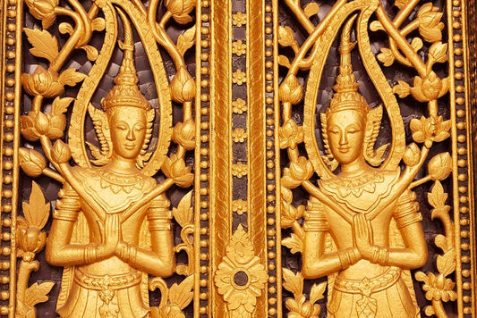 Laos- Luang Prabang. Haw Pha Bang-Carved panel on wall. White Modern Wood Framed Art Print with Double Matting by Haseltine, Tom