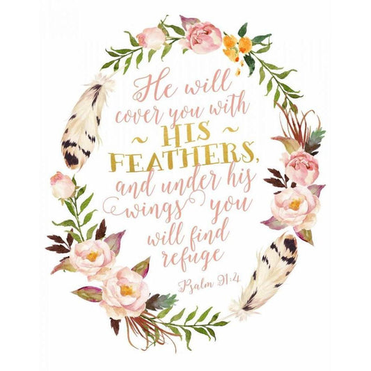 Psalm 91-4 Pink and Gold Wreath Black Modern Wood Framed Art Print with Double Matting by Moss, Tara