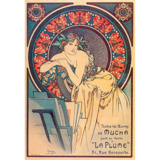 Mucha La Plume White Modern Wood Framed Art Print by Vintage Apple Collection