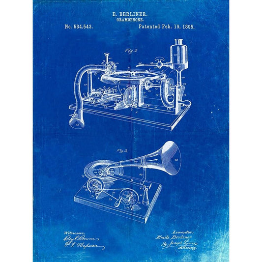 PP160- Faded Blueprint Berliner Gramophone Poster White Modern Wood Framed Art Print by Borders, Cole