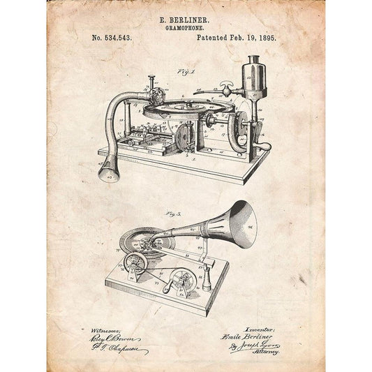 PP160- Vintage Parchment Berliner Gramophone Poster White Modern Wood Framed Art Print by Borders, Cole