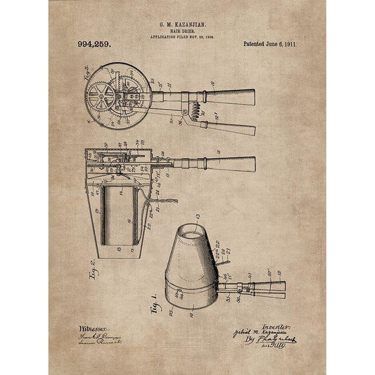 Patent Document of a Hair Dryer White Modern Wood Framed Art Print by CAG