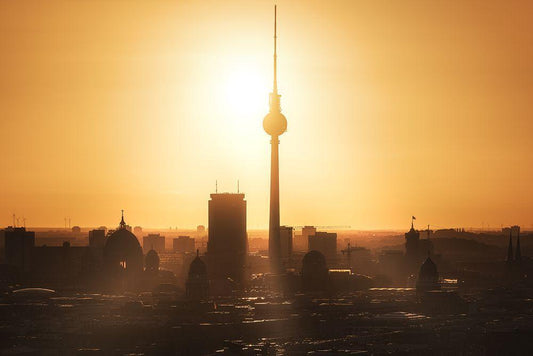 Berlin - Skyline Sunrise White Modern Wood Framed Art Print with Double Matting by Claude Castor, Jean