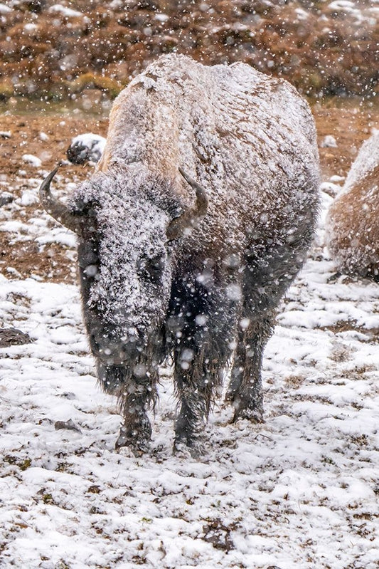 USA- Wyoming- Yellowstone National Park. Bison in falling snow. White Modern Wood Framed Art Print with Double Matting by Jaynes Gallery