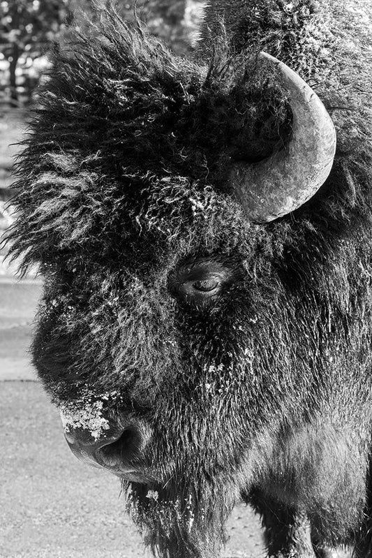 USA-Wyoming-Yellowstone National Park-Lone male American bison-aka buffalo with frost on face-Head White Modern Wood Framed Art Print with Double Matting by Hopkins, Cindy Miller
