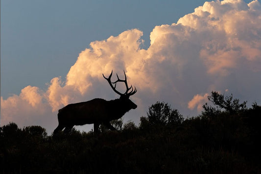 Bull elk or wapiti silhouetted at sunrise on ridge-Yellowstone National Park-Wyoming White Modern Wood Framed Art Print with Double Matting by Jones, Adam