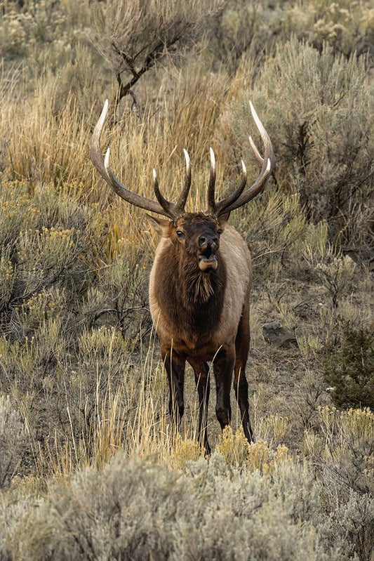 Bull elk bugling or wapiti-Yellowstone National Park-Wyoming White Modern Wood Framed Art Print with Double Matting by Jones, Adam