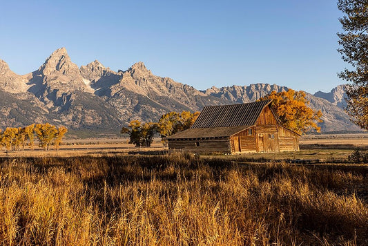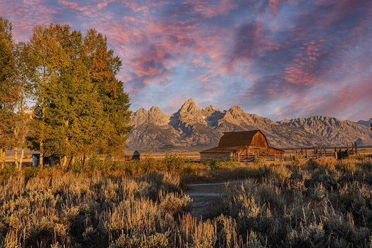 Moulton barn at sunrise and Teton Range-Grand Teton National Park-Wyoming White Modern Wood Framed Art Print with Double Matting by Jones, Adam