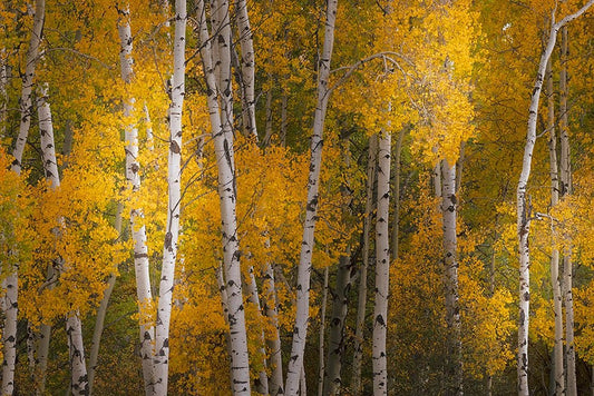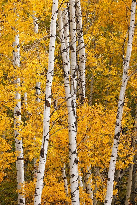 Pattern of white tree trunks among golden aspen leaves-Grand Teton National Park-Wyoming White Modern Wood Framed Art Print with Double Matting by Jones, Adam