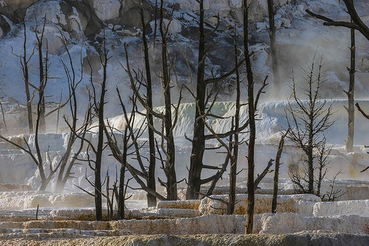 Black tree trunks and terrace-Mammoth Hot Springs-Yellowstone National Park-Wyoming White Modern Wood Framed Art Print with Double Matting by Jones, Adam