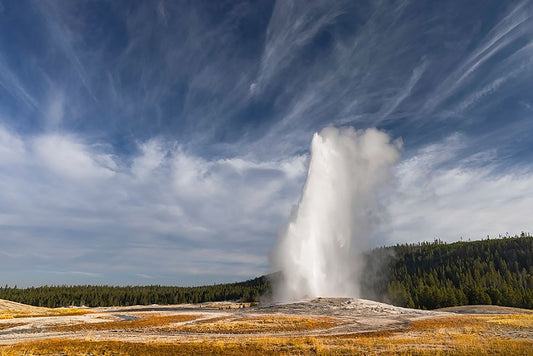 Old Faithful geyser erupting-a cone geyser in the Upper Geyser Basin White Modern Wood Framed Art Print with Double Matting by Jones, Adam