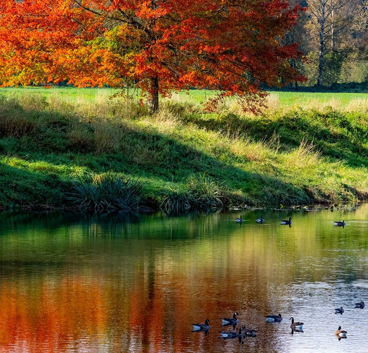 USA-Washington State-Fall City-Snoqualmie River and fall colored maple tree in reflection White Modern Wood Framed Art Print with Double Matting by Gulin, Sylvia
