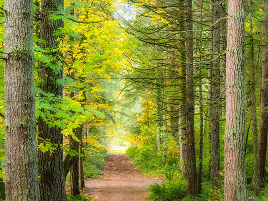 USA-Washington State-Sammamish with trail edged by evergreens and maple trees White Modern Wood Framed Art Print with Double Matting by Gulin, Sylvia