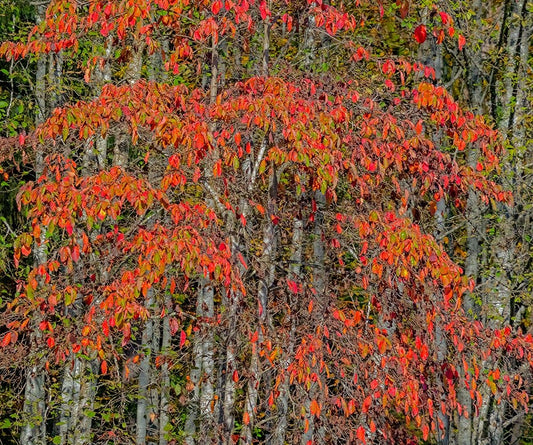 USA-Washington State-Snoqualmie cherry trees in red with backdrop of Alder Tree Trunks White Modern Wood Framed Art Print with Double Matting by Gulin, Sylvia
