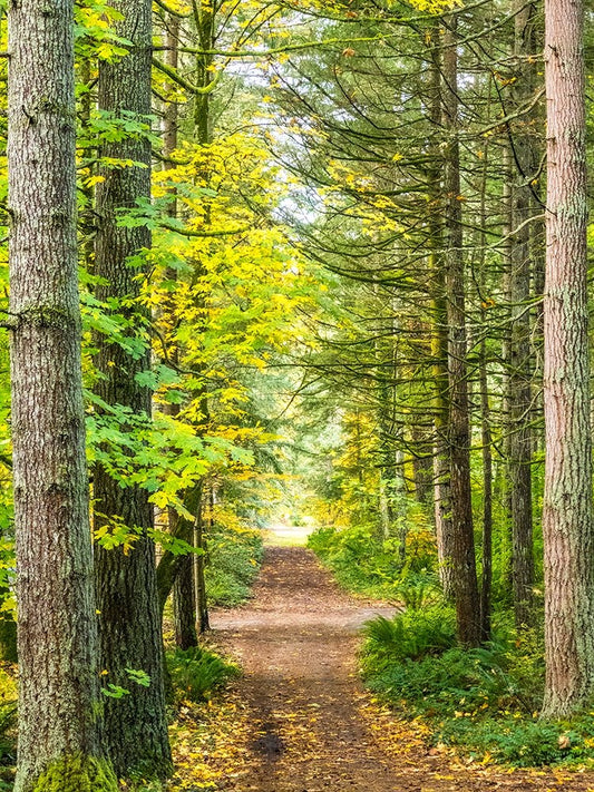 USA-Washington State-Sammamish with trail edged by evergreens and maple trees White Modern Wood Framed Art Print with Double Matting by Gulin, Sylvia