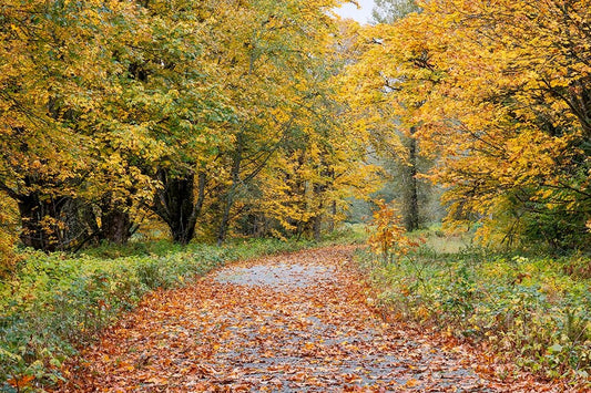 USA- Washington State- Darrington. Curved roadway in autumn forest of fir and vine maple trees White Modern Wood Framed Art Print with Double Matting by Gulin, Darrell