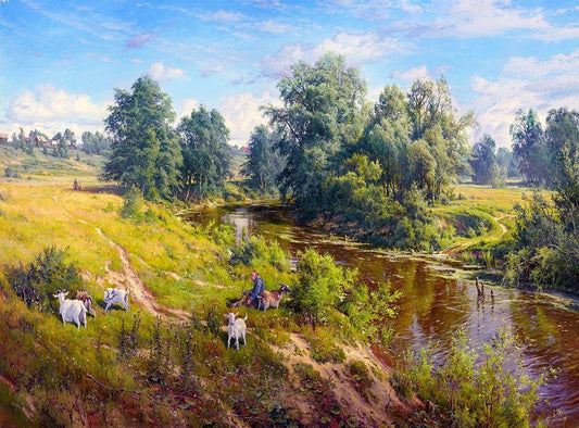 Landscape with river White Modern Wood Framed Art Print with Double Matting by Basov, Sergej