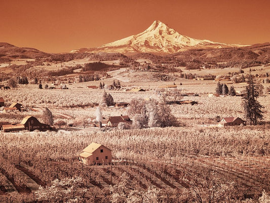 USA-Oregon-Columbia Gorge Infrared of spring orchards in bloom and Mount Hood White Modern Wood Framed Art Print with Double Matting by Eggers, Terry