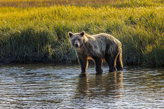 Adult grizzly bear on shoreline at sunrise-Lake Clark National Park and Preserve-Alaska White Modern Wood Framed Art Print with Double Matting by Jones, Adam