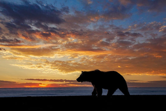 Adult grizzly bear silhouetted on beach at sunrise-Lake Clark National Park and Preserve White Modern Wood Framed Art Print with Double Matting by Jones, Adam