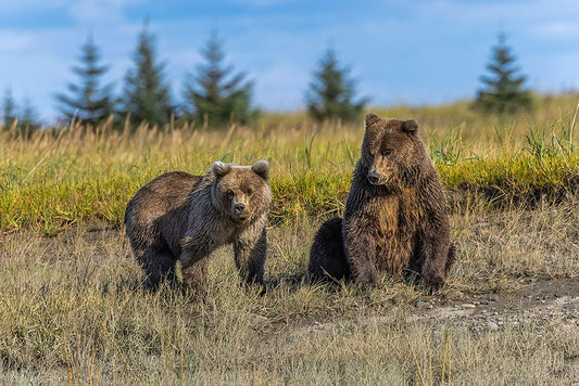 Grizzly bear cub and adult female-Lake Clark National Park and Preserve-Alaska-Silver Salmon Creek White Modern Wood Framed Art Print with Double Matting by Jones, Adam