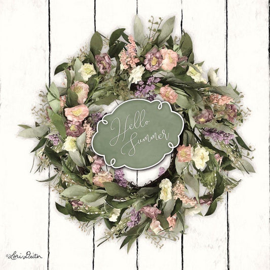 Hello Summer Wreath White Modern Wood Framed Art Print with Double Matting by Deiter, Lori