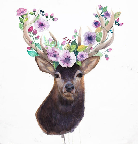 DEER HEAD WITH FLOWERS White Modern Wood Framed Art Print with Double Matting by Atelier B Art Studio