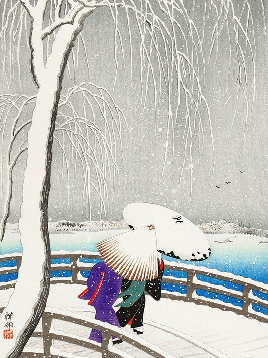 Two women in the snow on Yanagi Bridge White Modern Wood Framed Art Print with Double Matting by Koson, Ohara
