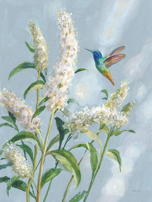 Hummingbird Spring II Soft Blue White Modern Wood Framed Art Print with Double Matting by Nai, Danhui