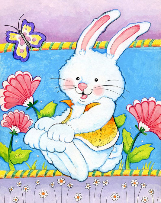 Bunny and Flowers White Modern Wood Framed Art Print with Double Matting by Wade, Valarie