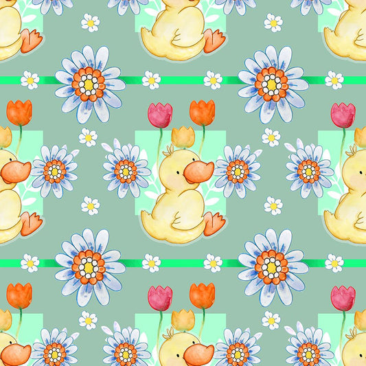Duckie And Blue Flower White Modern Wood Framed Art Print with Double Matting by Wade, Valarie