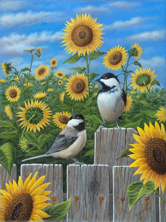 Chickadees And Sunflowers White Modern Wood Framed Art Print with Double Matting by Wavra, Robert