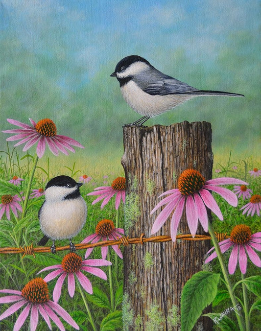 Chickadees and Coneflowers White Modern Wood Framed Art Print with Double Matting by Wavra, Robert