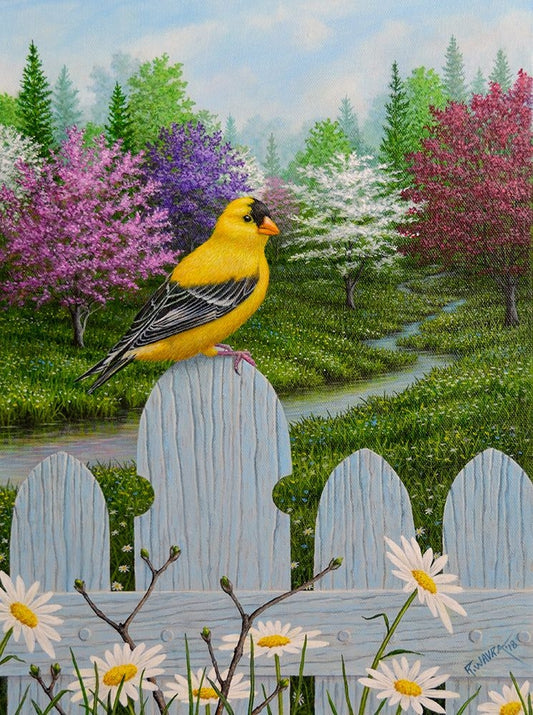 Goldfinch and Daisies White Modern Wood Framed Art Print with Double Matting by Wavra, Robert
