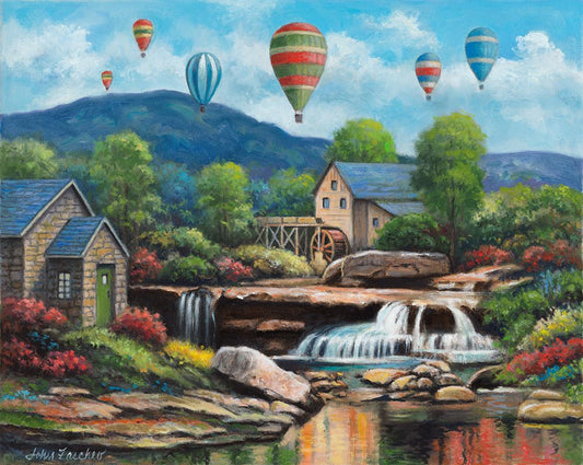 Spring Balloons Over The Mill White Modern Wood Framed Art Print with Double Matting by Zaccheo, John