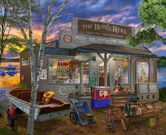 The Rod and Reel White Modern Wood Framed Art Print with Double Matting by Bigelow Illustrations- Exclusive