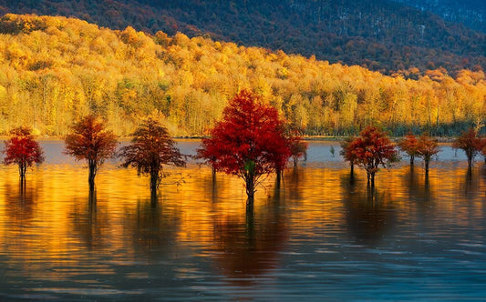Foggy a Fall Foliage at Caddo Lake White Modern Wood Framed Art Print with Double Matting by Z, Leechee