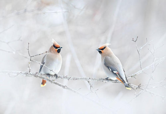 Bohemian Waxwings White Modern Wood Framed Art Print with Double Matting by Cumming, Jim
