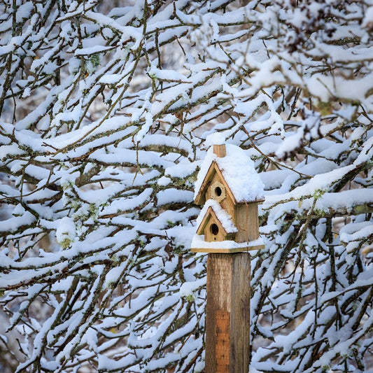 USA- Washington State- Seabeck. Snow-covered bird house and tree limbs. Black Ornate Wood Framed Art Print with Double Matting by Jaynes Gallery