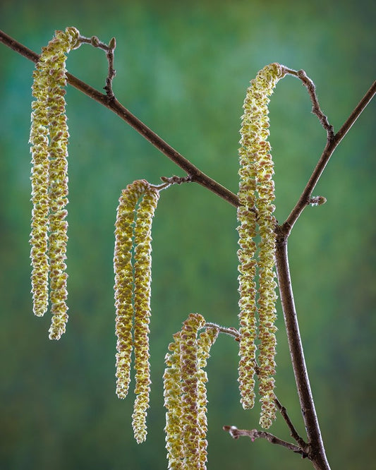 USA- Washington State- Seabeck. Pollen-producing male parts of beaked hazelnut catkin plant. Black Ornate Wood Framed Art Print with Double Matting by Jaynes Gallery