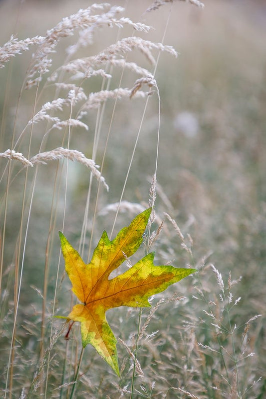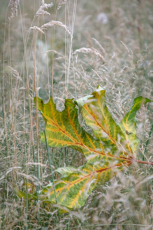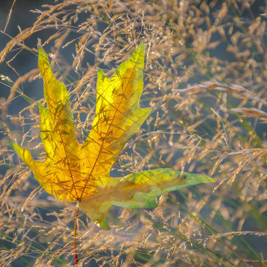 USA-Washington State-Seabeck Autumn bigleaf maple leaf caught in grasses Black Ornate Wood Framed Art Print with Double Matting by Jaynes Gallery
