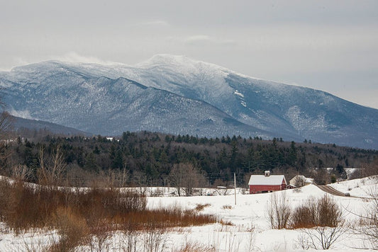 USA-Vermont-Cambridge Lower Pleasant Road-toward the west side of Mount Mansfield-snow on field Black Ornate Wood Framed Art Print with Double Matting by Jones, Allison