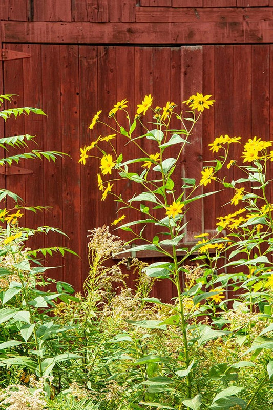 USA-Vermont-New England-autumn daisies against red barn Black Ornate Wood Framed Art Print with Double Matting by Jones, Allison