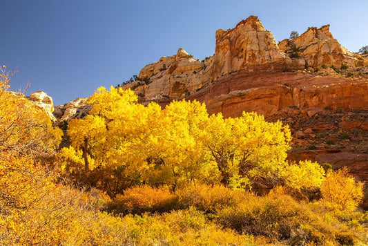 USA- Utah- Capitol Reef National Park. Red rock formation and fall cottonwood trees. Black Ornate Wood Framed Art Print with Double Matting by Jaynes Gallery