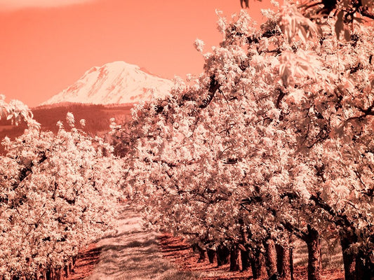 USA-Oregon-Columbia Gorge Infrared of spring orchards in bloom and Mount Hood Black Ornate Wood Framed Art Print with Double Matting by Eggers, Terry