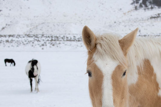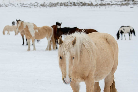 USA-Montana-Gardiner Palomino paint horse with shaggy winter coats in snow Black Ornate Wood Framed Art Print with Double Matting by Hopkins, Cindy Miller