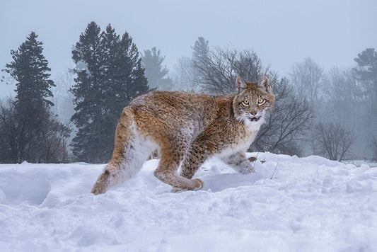 USA- Montana. Captive bobcat in snow. Black Ornate Wood Framed Art Print with Double Matting by Jaynes Gallery