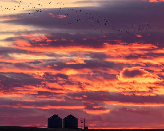 Snow geese silhouetted against sunrise sky during spring migration at Freezeout Lake Wildlife Manag Black Ornate Wood Framed Art Print with Double Matting by Haney, Chuck