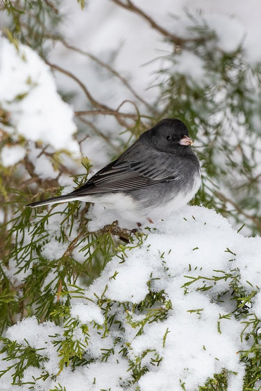Dark-eyed Junco-Junco hyemalis-feeding in Red Cedar in winter-Marion County-Illinois Black Ornate Wood Framed Art Print with Double Matting by Day, Richard and Susan